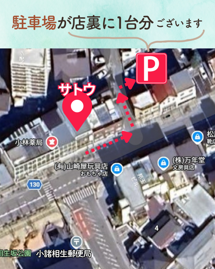 アクセス 2023 04/12 Updated 2024.01.30 2023 04/12 Published 2023.04.12 / sato 〒384-0025 長野県小諸市相生町3丁目1−9 アクセス方法 ○小諸駅から中央通りをまっすぐ徒歩約10分。○店舗裏に駐車場が1台分ございます。初めてご来店の方はご案内いたしますので、一旦店前にお車をお停めください。 ミントグリーン色が目印です。