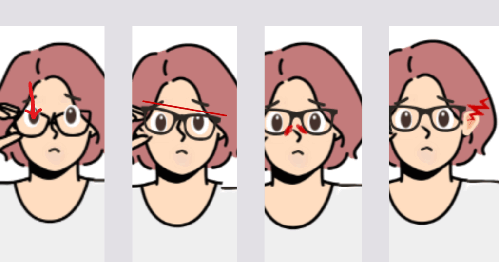 下を向くとずり落ちるだけでなく、鼻や耳周りの痛みもズレのサインです。耳は毛細血管がたくさん通っていて、メガネがずれていると痛みを生じます。